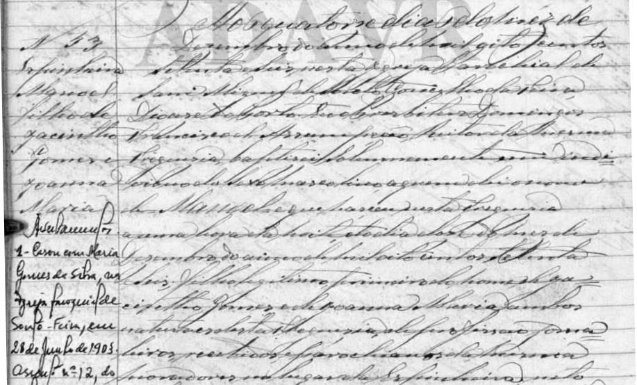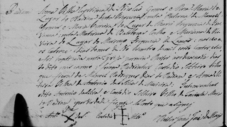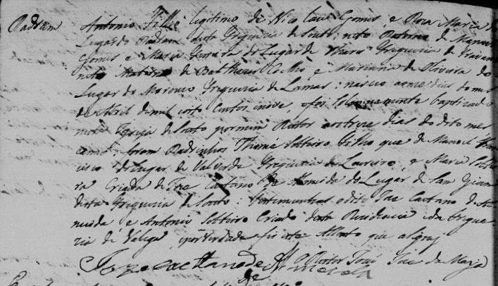 “Nicolau Gomes, filho legítimo de Manuel Gomes e Maria Ferreira, do Lugar de Tarei, freguesia de Travanca, neto paterno de José Gomes e Isabel Ferreira, do Lugar do Lameiro, da dita freguesia, e neto materno de Manuel Godinho e Maria Fernandes, do Lugar de Tarei, da freguesia de Souto, e